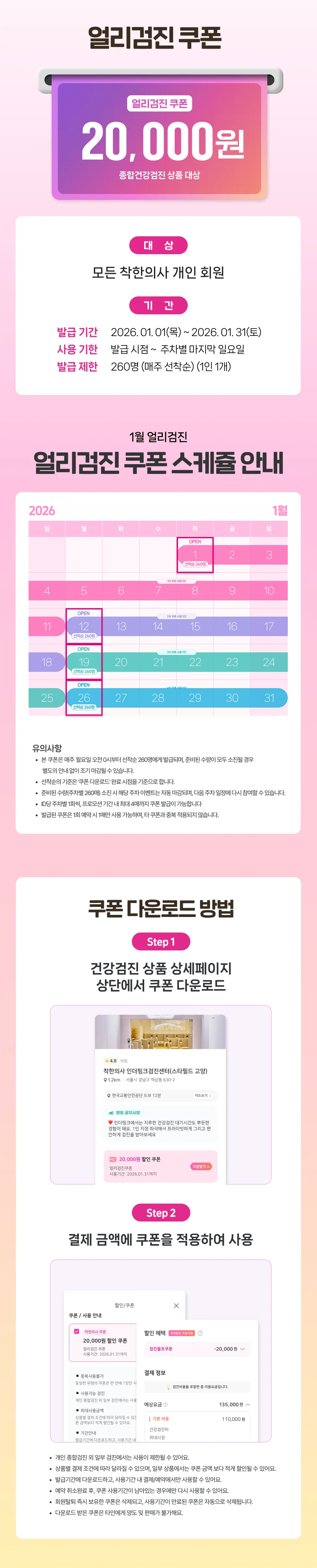 얼리검진쿠폰 : 종합건강검진 1회 당 최대 20,000원의 금액 쿠폰 사용이 가능합니다.